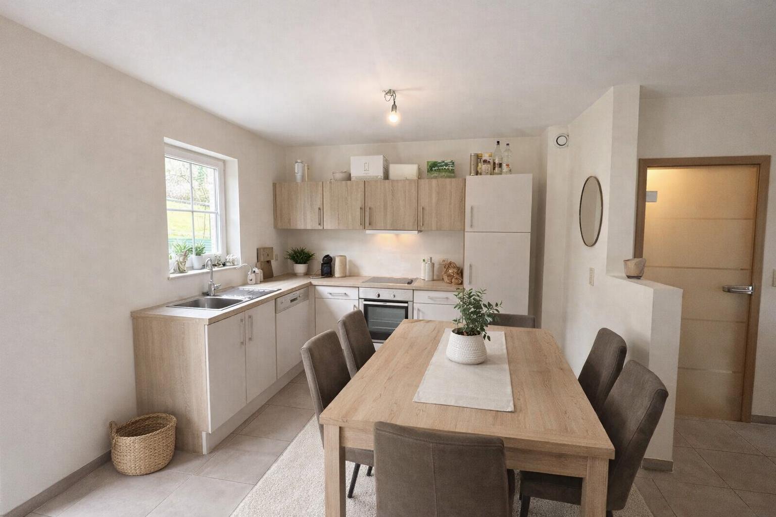 Séjour avec cuisine équipée (lave-vaisselle, four, plaque vitrocéramique, réfrigérateur et hotte)